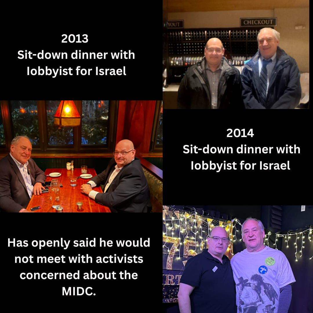 Marc Elrich is the current County Executive and a staunch supporter for funding of the Maryland Israel Development Center. He has openly refused to meet with concerned activists. Yet, he has sit-down dinners with the local lobbyist for Israel.